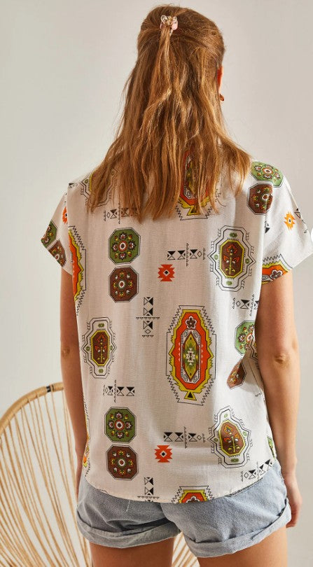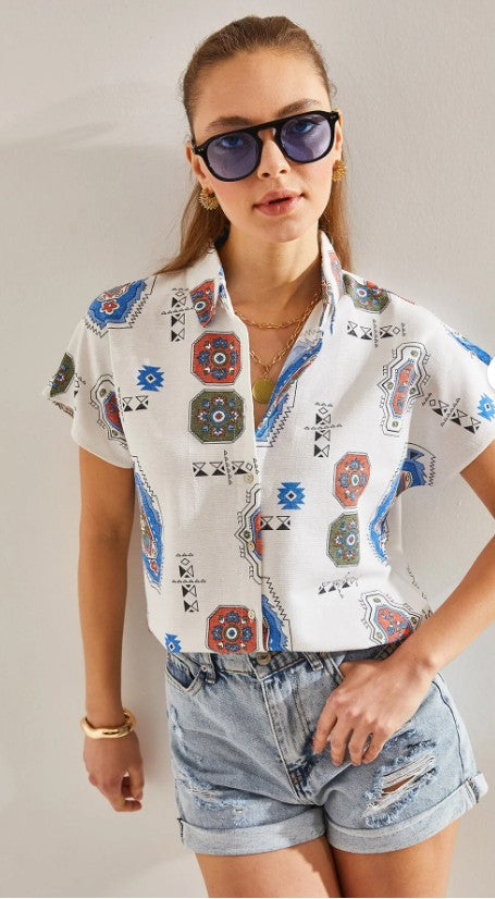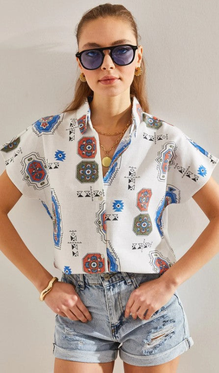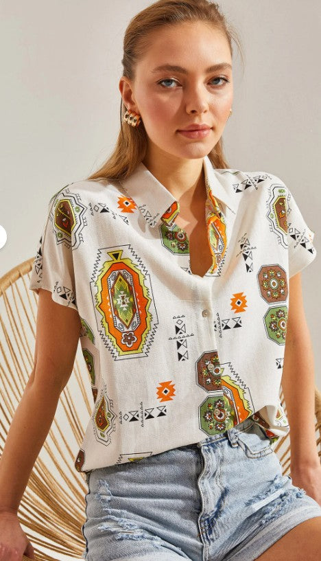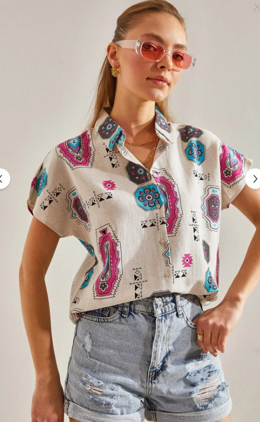 Crafted for women who move with confidence and ease, this patterned batwing sleeve shirt blends natural texture with refined fluidity. The 50% linen and 50% viscose fabric brings together the best of both worlds: linen’s breathable, fresh character and viscose’s silky softness and graceful drape.